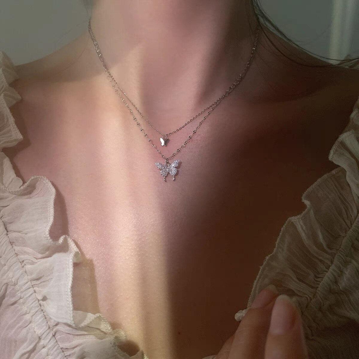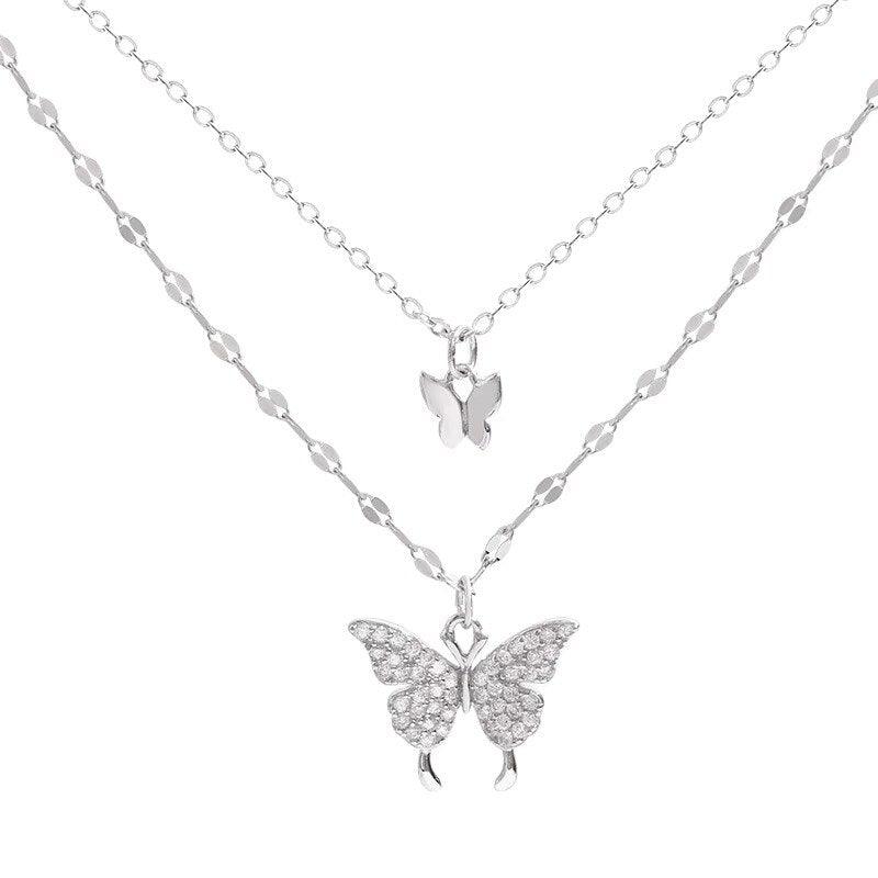 How about a little bit of whimsy with your jewelry? This beautiful butterfly necklace is perfect for adding a touch of personality to any outfit. The double layer chain is crafted from 925 sterling silver and features two delicate butterflies. The larger butterfly is covered in glittering zircon stones, adding a touch of sparkle. It's a fun and feminine piece that's perfect for everyday wear or dressing up for a special occasion.