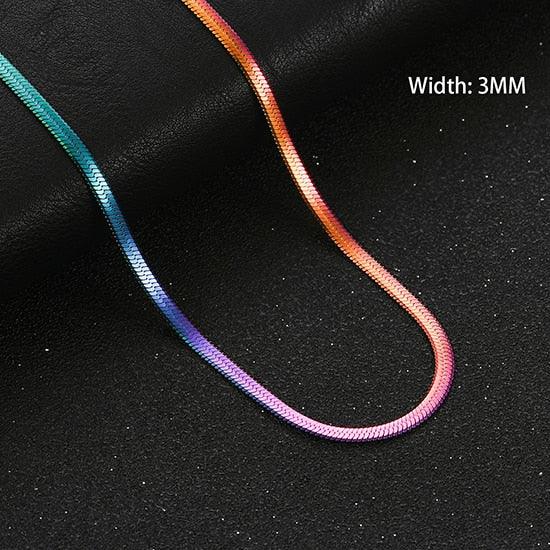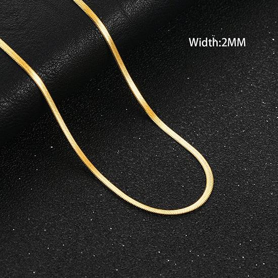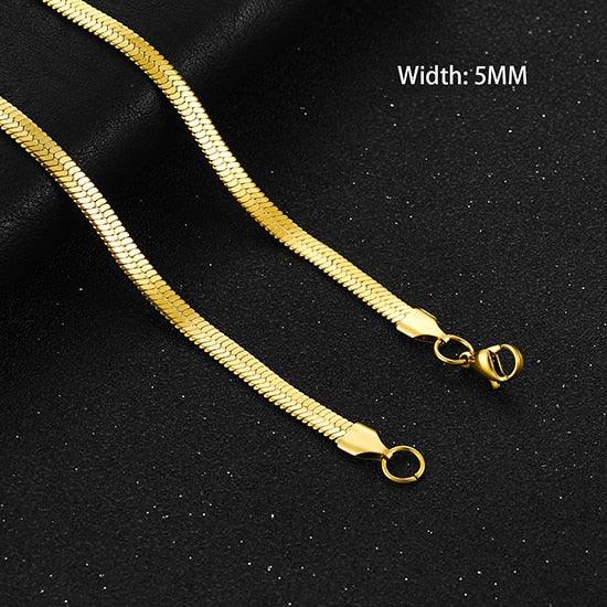 Introducing our fashionable Flat Gold Color Stainless Steel Necklace Blade Chain, designed for both men and women who appreciate trendy choker jewelry. Available in various widths ranging from 2mm to 5mm, this necklace offers versatility and personalization to suit your style. Crafted with precision from high-quality stainless steel, this necklace boasts a sleek and flat design, providing a modern and edgy look. The gold color adds a touch of elegance and sophistication to any outfit, making it a perfect accessory for both casual and formal occasions.