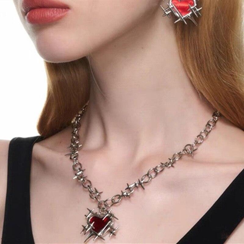 Introducing our new Red Thorns Love Heart Necklace and Earrings! This beautiful set is perfect for adding a touch of gothic elegance to any outfit. The necklace features a stunning pendant in the shape of a love heart, with intricate thorns and cross details. The earrings are simple yet stylish, with small love hearts suspended from delicate chains. Both pieces are crafted from high quality materials, and are sure to become your go-to pieces for any special occasion. So don't wait any longer, order your set today and add a touch of gothic glamour to your look!