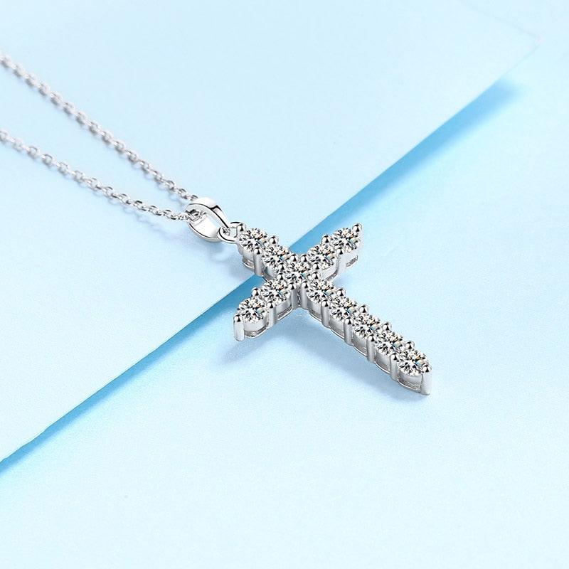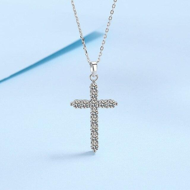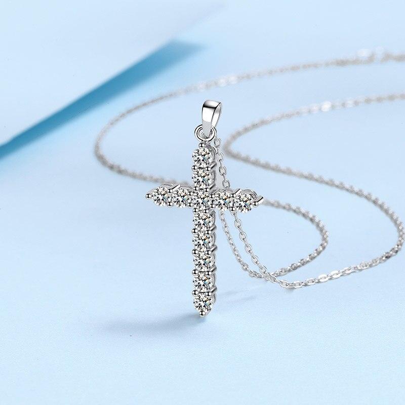 Elevate your jewelry collection with the Moissanite Cross Pendant Necklace. This luxurious necklace is designed for women and crafted from 925 sterling silver plated with platinum. The Moissanite stones on the cross pendant exhibit a stunning D color, reminiscent of fine diamonds. Perfect for special occasions or as a statement piece, this necklace is the epitome of luxury and fine jewelry. Embrace elegance and brilliance with this exquisite cross pendant necklace.