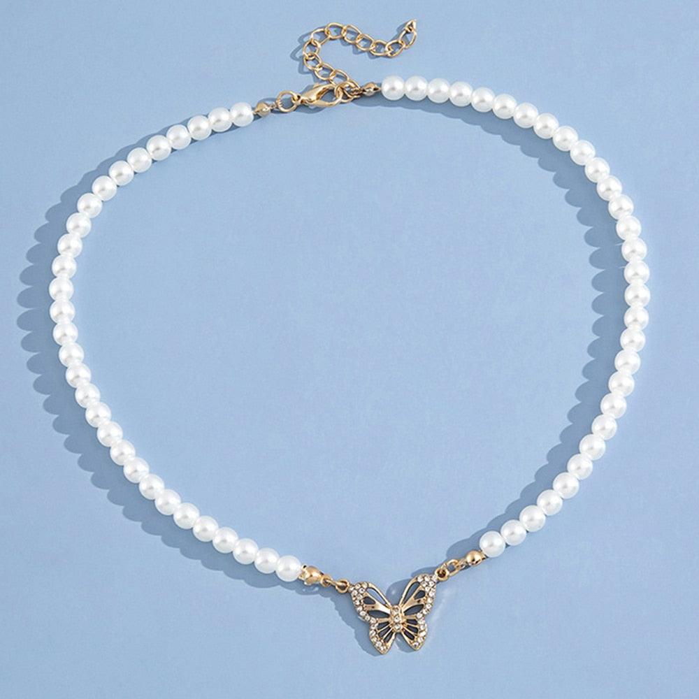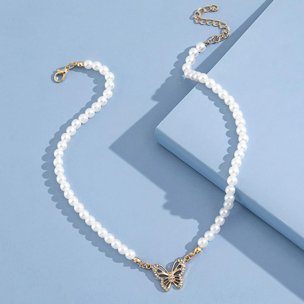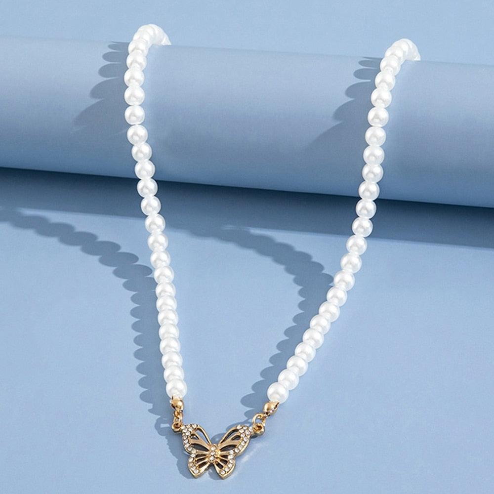 Rhinestone Butterfly Pendant Pearl Necklace
