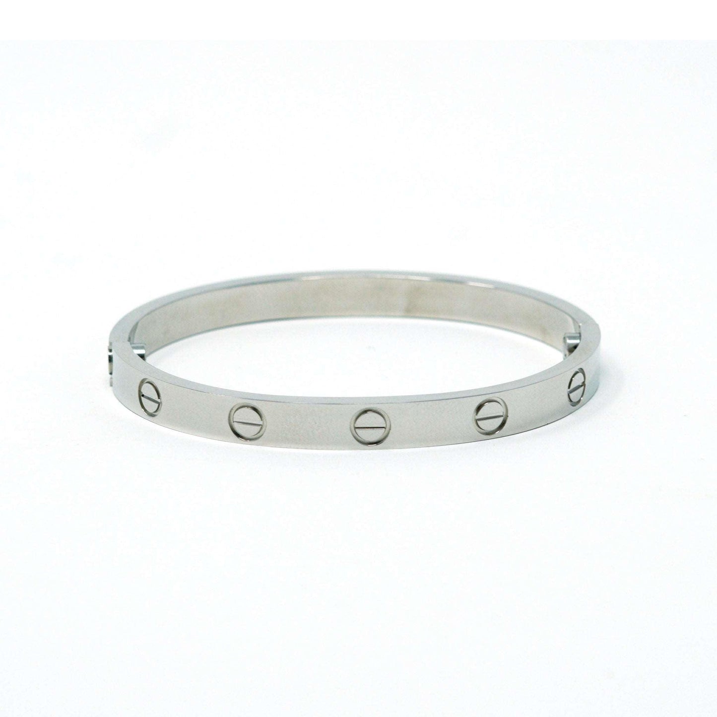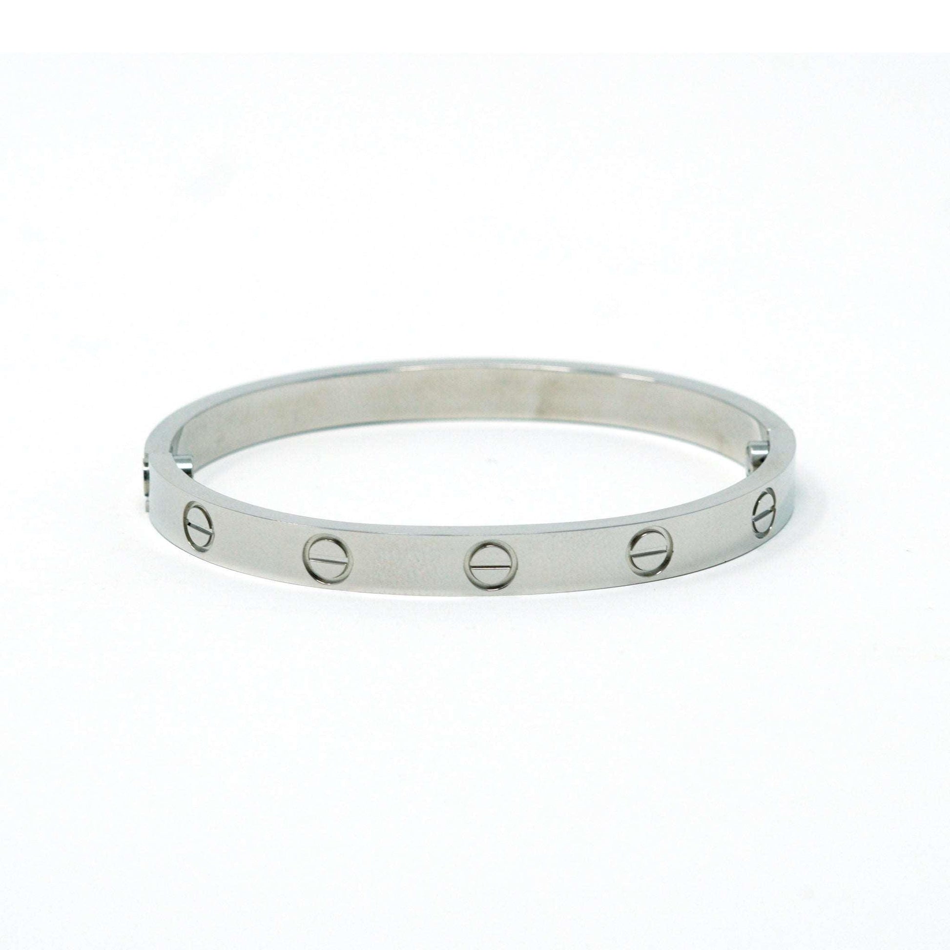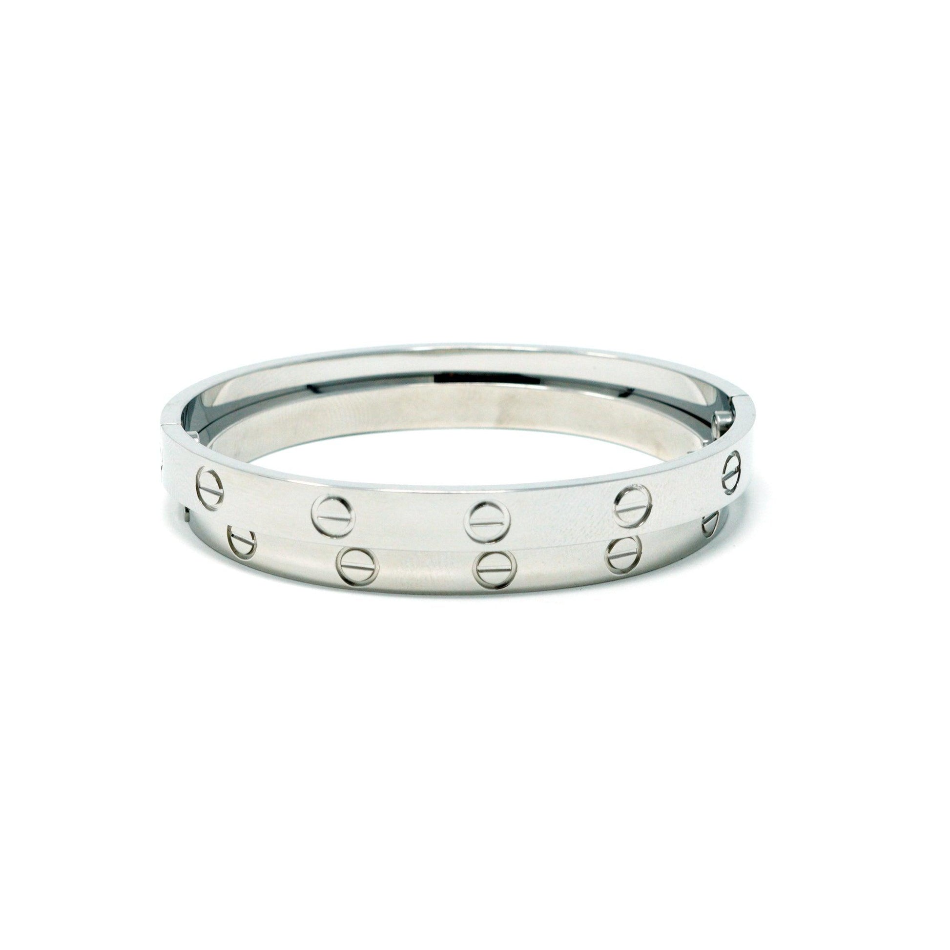 Make a bold statement with the Silver Love Bracelet, crafted from luxurious sterling silver. With its intricate design that features accents of a single screw and subtle details, this contemporary yet timeless piece is ideal for special occasions or to add sparkle to any everyday look. A sophisticated alternative to Cartier's iconic Love Bracelet, the Silver Love Bracelet has a modern take on traditional arm candy. Perfect for anyone looking for an affordable luxe bracelet, this unique accessory is sure to give you a signature look! Each bracelet is sold separately and comes with a mini screwdriver. Get your Silver Love Bracelet and make a statement today!