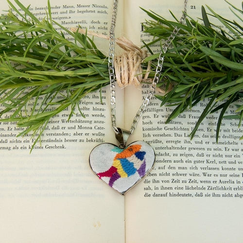 Heart-shaped pendant with a colorful handmade Otomi embroidery insert mounted on an aluminum case; the fabric and embroidery thread are 100% cotton.