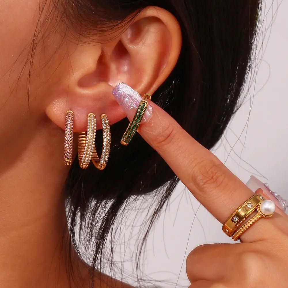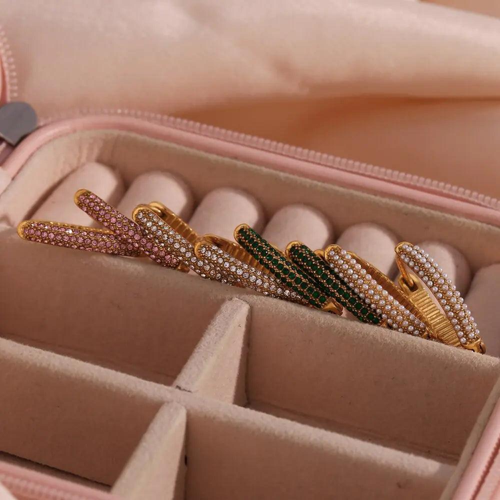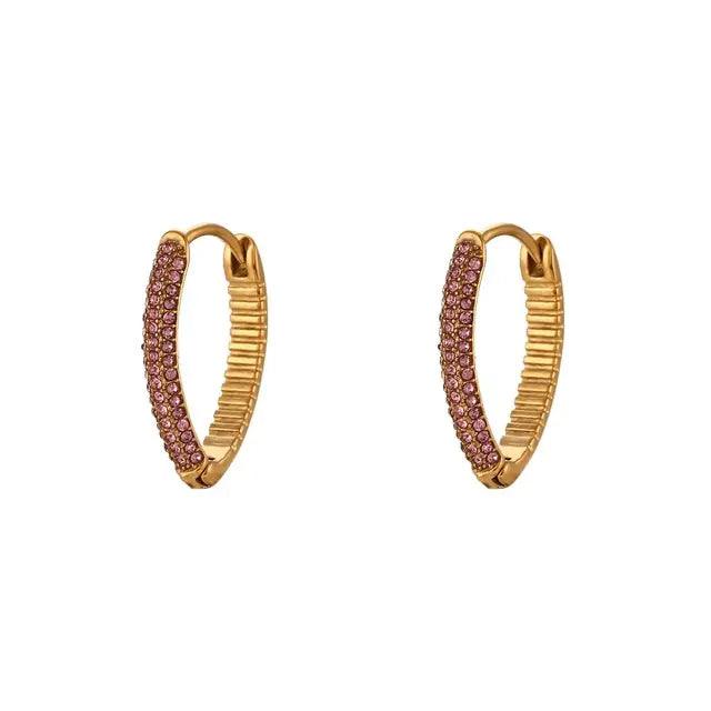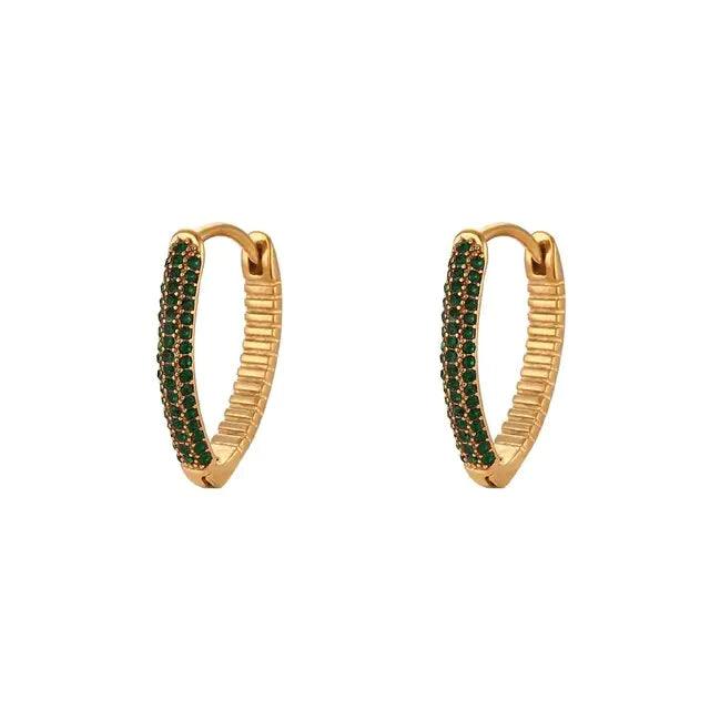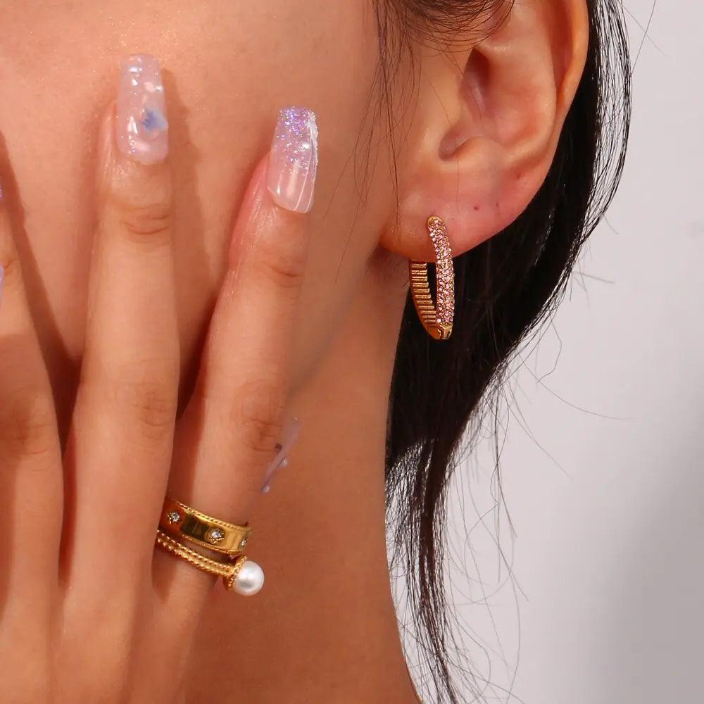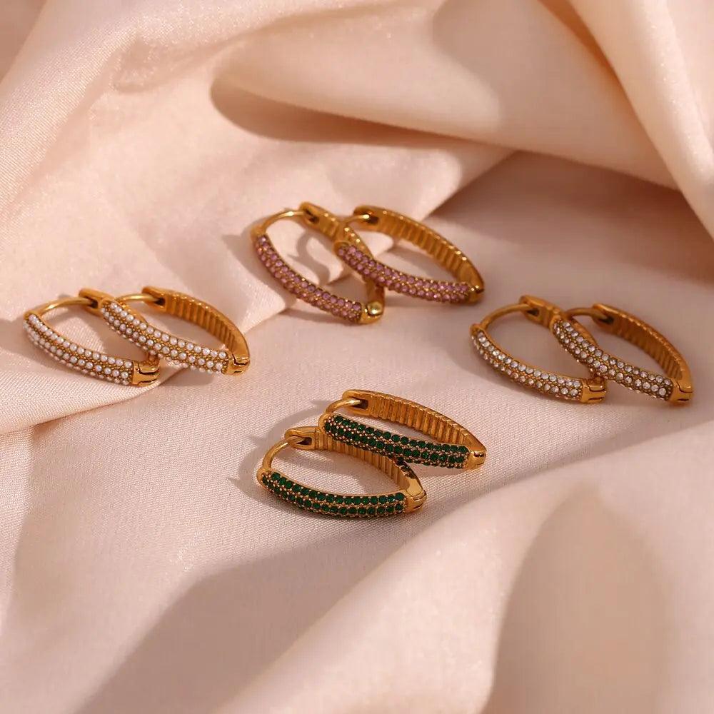 🌟 Glamorous Design: Adorned with micro-paved pink and green crystal pearls, these hoop earrings boast a chic V-shaped silhouette that's sure to turn heads.