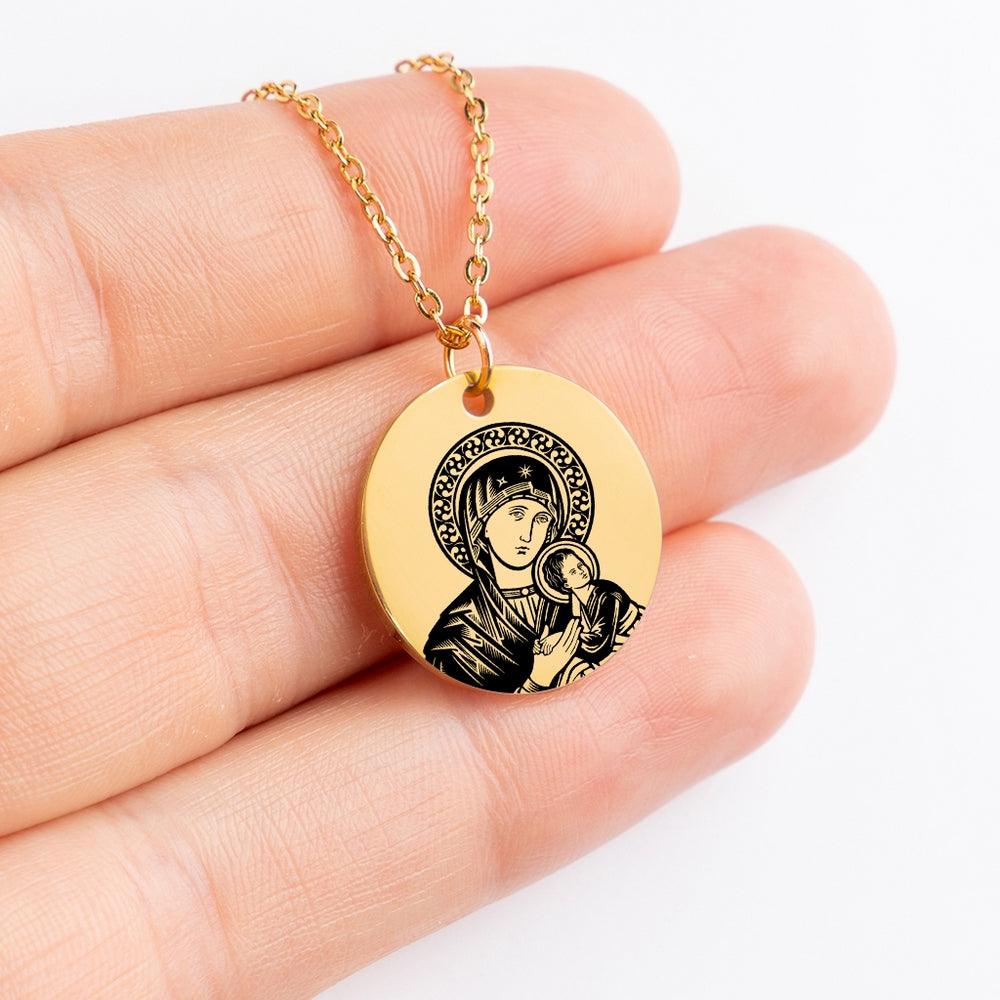 Create a truly unique gift with this religious necklace of Mother Mary and Baby Jesus. Optionally, you can choose to give the necklace an even more personal touch by adding a custom message, bible verse or date coordinates on the back.